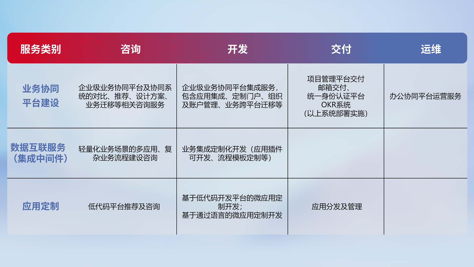 针对钉钉、、企微、、IDaas等平台级产品提供产品的规划、、、、方案、、、交付、、、、定制化开发等服务,,实现如统一协同办公、、智能客户服务、、、、混合会议管理、、、智能数据查询、、、等业务场景,,,,实现数字化转型。。。。